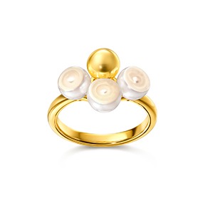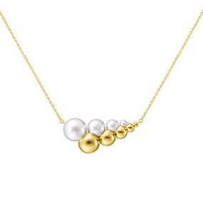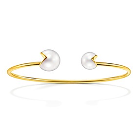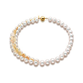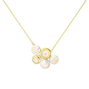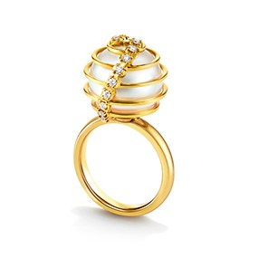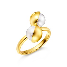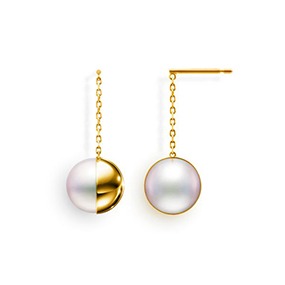 パールをスライスし、イエローゴールドの球体と連ねて断面の美しさを際立たせた「SLICED SPHERE(スライスド スフィア)」、半円のゴールドがパールを包み込み、